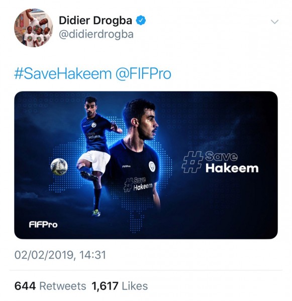 ونشر النجم الإيفواري المعتزل على حسابه عبر موقع التواصل الاجتماعي تويتر صورة للعريبي على حسابه على تويتر بالإضافة إلى وسم (SaveHakeem).