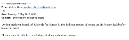 في أوائل شهر أيار/مايو، تم تنبيهنا إلى أنه كان يتم استهداف الناشطين البحرينيين برسائل البريد الإلكتروني الضارة. رسائل البريد الإلكتروني التي كانت تتعلق ظاهريا بالاضطرابات الحالية في البحرين، وكانت تشجع المتلقين لفتح سلسلة من المرفقات المشبوهة. صورة الشاشة التي في الأسفل هي مؤشرعلى محتوى رسالة نموذجية: