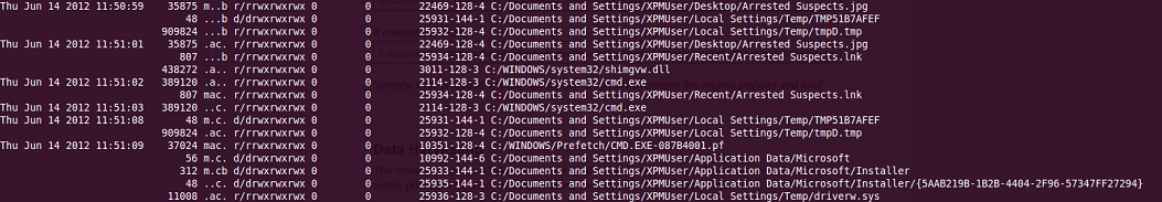 ويمكن ملاحظة هذه العملية على الجدول الزمني لنظام ملفات الكمبيوتر المصاب (اضغط على الصورة للتكبير):