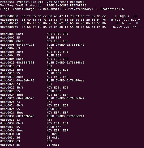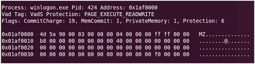فحص صورة الذاكرة في جهاز مصاب بالبرمجيات الضارة يبين أنه تم استخدام تقنية ما لإصابة العمليات المعروفة باسم "عملية التفريغ". على سبيل المثال، مقطع الذاكرة أدناه من عملية "winlogon.exe" تم تحديدها على أنها قابلة للتنفيذ والكتابة: