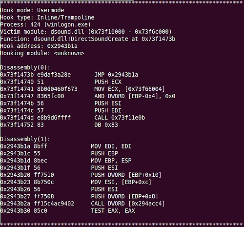 وهنا تبدأ البرمجيات الضارة بمثال جديد من عملية مشروعة مثل "winlogon.exe"، وقبل أن تبدأ عملية الترابط الأولى، تقوم البرمجيات الضارة بالغاء تخصيص الذاكرة التي تحتوي على رمز الشرعية وتدخل الشيفرات الضارة في مكانها. تفريغ وفحص مقطع الذاكرة هذا يكشف النقاب عن السلاسل التالية في العملية المصابة: