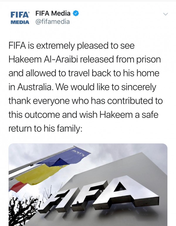 وقال البيان إن «الفيفا سعيد للغاية بالإفراج عن حكيم العريبي في تايلاند، والسماح له بالعودة إلى منزله في أستراليا، وذلك نتاج للعمل والتعاون بين منظمات حقوق الإنسان والحكومات ومجتمع كرة القدم في آخر شهرين».