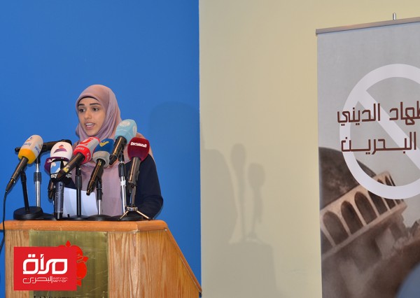 وعن مركز البحرين لحقوق الإنسان، تحدثت الأستاذة غنى فروخ، فأشارت إلى حلول البحرين في التقرير السنوي للجنة الأمريكية للحريات الدينية الدولية، للسنة الثالثة على التوالي، كدولة ضمن المستوى الثاني لانخراطها في انتهاك الحريات الدينية، ويدل هذا على استمرار السلطة في انتهاج انتهاكات ضد الحريات الدينية في البحرين.