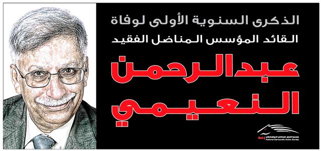 مرآة البحرين (خاص): تنظم جمعية العمل الديموقراطي "وعد" ندوة بعنوان "النعيمي في عيون رفاقه"، لمناسبة مرور عام على ذكرى وفاة المناضل عبدالرحمن النعيمي، وذلك الساعة الثامنة والنصف مساء يوم الأحد المقبل في مقر الجمعية في أم الحصم.