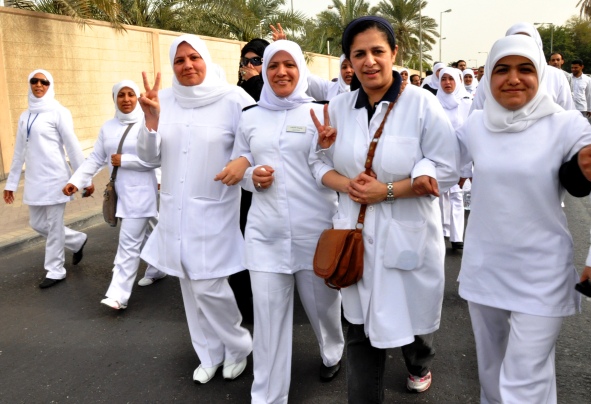 15 فبراير/ شباط كان أول اعتصام في الدوار. وصلت الساعة الثاثة عصرا، المتجمهرون لا يزالون قلة. أوقفت سيارتي بمحاذاة رصيف الدوار. لحظات وبدأت أرى حشودا تتدفق من كل ناحية، كنت مندهشة وخائفة من ضربة أمنية. أبعدت سيارتي إلى محيط مجمع الدانة، الناس تتدفق من كل الأعمار، أطفال، ونساء،و شباب، وكهول، ونساء حوامل، ومعاقون، وآخرون على كراسٍ متحركة. كان عرسا خياليا يتحول إلى حقيقة لم أستوعبه بعد وخصوصا أنه يحدث في البحرين. تحول نصب الدوار إلى قطب مغناطيس يجذب الناس إليه، تحول إلى كعبة والشعب في حج يتوافدون إليه من كل القرى والمدن، من كل مكان. امتلأت إطلالة الكوبري بسفحه الرحب الذي اكتظ بالناس، يغنون أغانيَ وطنية ويصفقون بأيد تتمايل في حركة واحدة وكأنها موج البحر، وهتافات استعاروها من بلدان الثورة : الشعب يريد إسقاط النظام، علقوا البنرات المنادية بنفس الشعار. ما زلت مغتبطة بهذا الحلم البحريني، لم أتوقع أن أهل البحرين متألمون إلى ذلك الحد، هذا الشعب لا يجمعه الفرح الآن بقدر ما يجمعه الهم والألم والذي حدا به للاعتصام خصوصا بعد سقوط أول شهيد. قررت ألا أعود إلى البيت للغَداء، ذهبت للعمل رحت أتفقدغرف الإنعاش .
