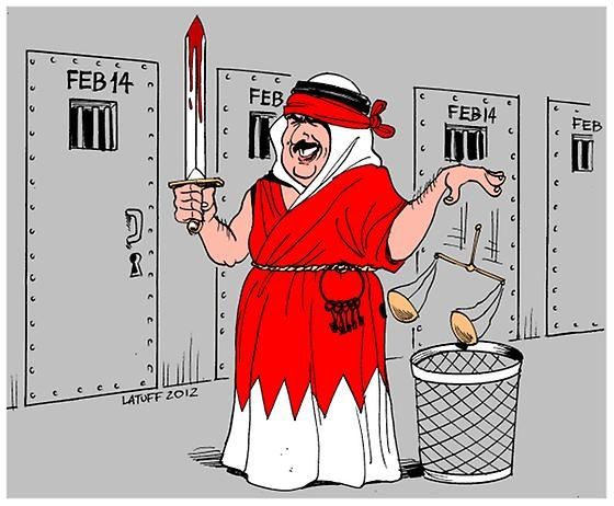 ويظهر الكاريكاتير الملك حمد بن عيسى آل خليفة، وهو يحمل بين إحدى يديه سيفاً مملوئاً بالدم فيما، والأخرى راحت تلقي بميزان العدالة داخل سلّة للمهملات. فيما ترتصف من الخلف عدد من الزنانزين كتب على رأس كل واحدة منها 14 فبراير/ شباط. في إشارة إلى محاكمات الرموز السياسيين.