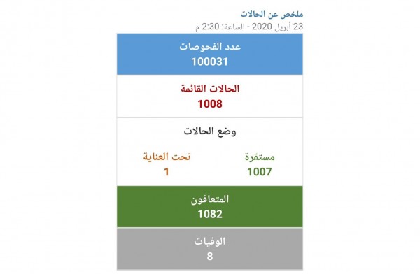 وفي ذات السياق، أعلنت وزارة الصحة عن تعافي 56 حالة إضافية وتسجيل 71 حالة قائمة جديدة منها 48 حالة لعمالة وافدة و 16 حالة لمخالطين و 7 حالات قادمة من الخارج.
