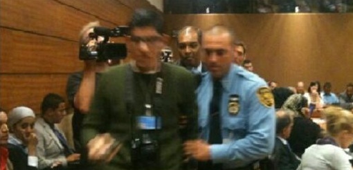 مرآة البحرين (جنيف): طرد فريق قناة «العربية» اليوم من ندوة بمجلس حقوق الإنسان، وهو الطرد الثاني له بعد أن تعرض رئيسه محمد العرب للطرد أمس. وحاول مصوّر الفريق البريطاني من أصل أحوازي، أمجد طه، والذي يعمل لصالح السفارة البحرينية في لندن تخريب الندوة الجارية في إحدى قاعات المجلس والتي يشارك فيها عدد من منظمات المجتمع المدني البحريني، وإشاعة الفوضى ما اضطرّ المنظمين إلى طرده من القاعة، وكذلك بقيّة الفريق التابع إلى قناة «العربية» وبينهم محمد العرب.
