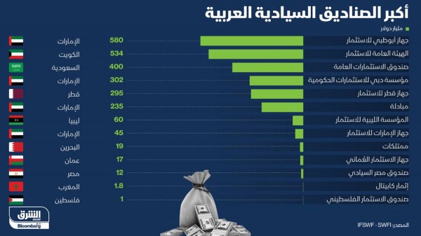 وقد حقق جهاز أبوظبي للاستثمار المركز الأول كأكبر صندوق سيادي عربي بقيمة 580 مليار دولار، تلاه الهيئة العامة للاستثمار الكويتي بـ534 مليار دولار، وصندوق الاستثمارات العامة السعودي بـ400 مليار دولار، تلتهم مؤسسة دبي للاستثمار الحكومية الاماراتية بـ302 مليار دولار، وخامسا جهاز قطر للاستثمار بـ295 مليار دولار.