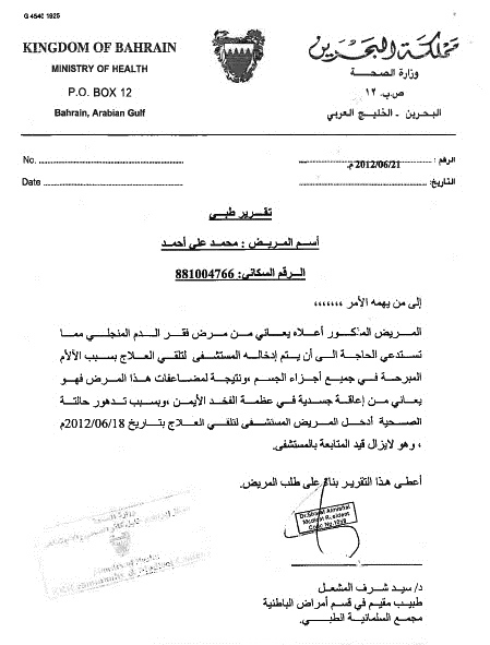 مرآة البحرين (خاص): كشف تقرير طبي صادر عن وزارة الصحة البحرينية (21 يونيو/حزيران 2012) عن الحالة الصحية التي كان يعاني منها الشهيد محمد مشيمع قبل وفاته. ويبين التقرير الذي عرضه محاميه محسن العلوي اليوم أن الشهيد «كان يعاني من آلام مبرحة في جميع أجزاء الجسم» إضافة إلى «إعاقة جسدية في عظمة الفخذ».