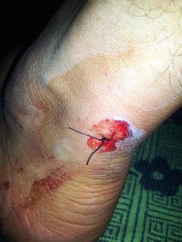 مرآة البحرين (خاص): تعرض شاب مشارك في ختام عزاء الشهيد محمد مشيمع، إلى اعتداء وحشي تسبب له بإصابات بليغة لا يزال يتلقى العلاج على إثرها. وقال الشاب الذي التقته مرآة البحرين، إن المرتزقة رموه من الطابق الثاني لأحد البيوت، ثم قفزوا على صدره، وقاموا بضربه بكل وحشية على رأسه، ثم طعنوه في رجليه الاثنتين.