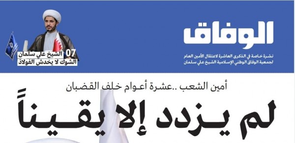 أصدرت جمعية الوفاق الوطني الإسلامية نشرة خاصة بمناسبة مرور عشرة أعوام على اعتقال أمينها العام الشيخ علي سلمان. وتضمنت النشرة 17 مقالًا لكتّاب وشخصيات سياسية ودينية بارزة، إضافةً إلى 6 قصائد لشعراء بحرينيين.