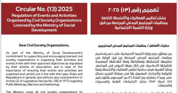مرآة البحرين: أصدرت وزارة التنمية الاجتماعية في البحرين تعميمها رقم 13 لسنة 2025 بشأن تنظيم الفعاليات والأنشطة الخاصة بمنظمات المجتمع المدني المرخّصة.