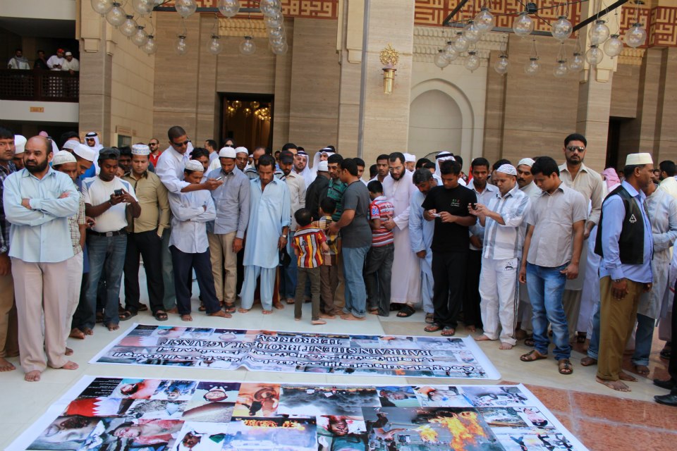 وتجمع العشرات عقب الصلاة، أغلبهم من الآسيويين والجاليات المقيمة، رافعين لافتات تنادي بالقصاص من المعارضين، وعدم السكوت، و«تطبيق القانون».