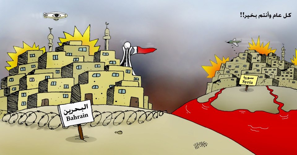 وقالت وكالة الأنباء السورية "سانا" إن النظام البحريني "يستعين بقواعد الولايات المتحدة العسكرية وقوات "درع الجزيرة"، متهمة المنامة بـ"ممارسة "النفاق" و"اضطهاد الشعب وقمعه وحرمانه من أبسط حقوقه (بينما) يذرف دموع التماسيح على الشعب السوري".