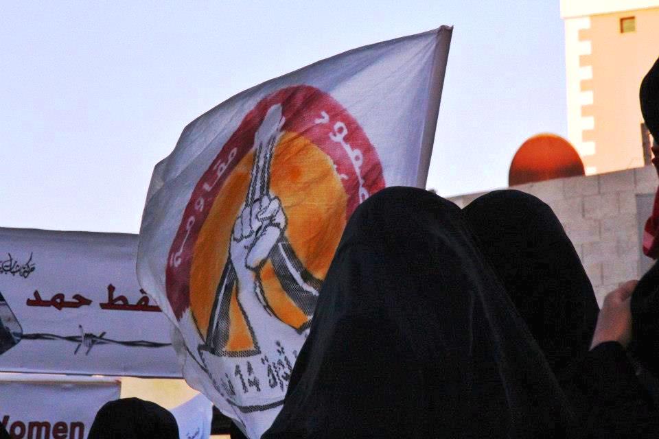 تقدمت المسيرة صفوف من الفتيات اللاتى غطين وجوههن وارتدين الأكفان، وحملن صور الشهداء من النساء والأطفال. علم ائتلاف الرابع عشر من فبراير كان مرفرفاً، مع لا فتات وبوسترات للفعالية المترقبة "محورنا المنامة".