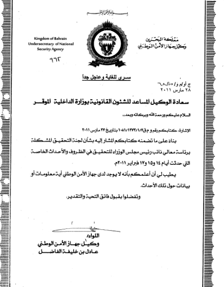 وأخيرا، فإن هذين المستندين يثبتان أيضا، بشكل لا يدع مجالا للشك، عدم جدية لجنة (جواد العريض) ومدى حجم التعاون والتنسيق بين وزارة الداخلية وجهاز الأمن الوطني، ودور (النيابة العامة) في هذا كله، وهو ملف آخر قد يحين أوان فتحه قريبا.