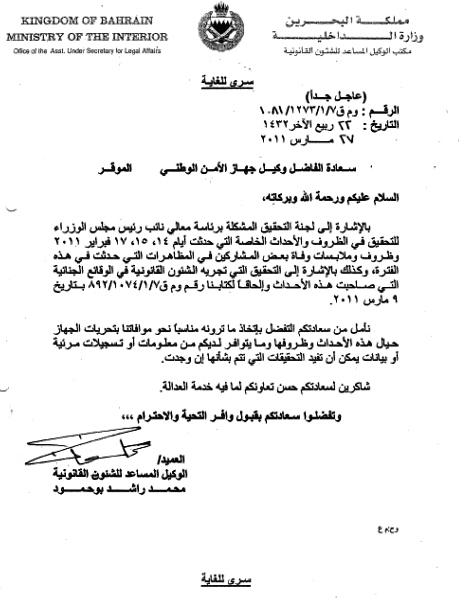 لكن "المرآة" ستعرض مستنداً رسميا آخر، يدحض هذا الادعاء، الذي بني عليه أصل القضية، ويحيله إلى سراب. هذا المستند، هو جواب رسمي من "جهاز الأمن الوطني" على رسالة من وكيل وزارة الداخلية المساعد للشؤون القانونية يطلب فيها من "جهاز الأمن الوطني" الرد على سؤال "لجنة التحقيق" التي شكلت بعد 17 فبراير/شباط 2011 برئاسة نائب رئيس الوزراء (جواد العريض) للتحقيق في الظروف والأحداث التي وقعت في أيام 14، 15، 17 فبراير/شباط 2011، كما ورد في نص الخطاب. وربط الخطاب طلبه هذا، بأنه سيفيد أيضا في التحقيق الذي تجريه إدارة "الشئون القانونية" بوزراة الداخلية، حول الأحداث ذاتها.