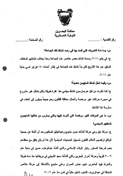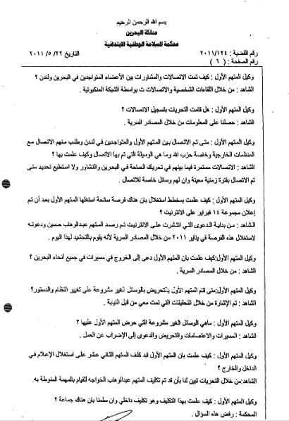 في تلك الجلسة يصر المحامي الذي دافع عن زعيم تيار الوفاء (عبدالوهاب حسين) على استجواب وكيل النيابة، واستجواب الشهود لمعرفة مصادر معلوماتهم وكيفية جمعها. وبحسب رد الشهود، الموثق في هذا المستند، فإن جهاز الأمن الوطني قام بجمع المعلومات والتحريات عن الرموز وتحركاتهم قبل 14 فبراير/شباط 2011، وهو ما شكل صلب الاتهام الموجه للرموز من حيث دعوتهم لتشكيل جماعة خارج القانون تهدف إلى قلب نظام الحكم.