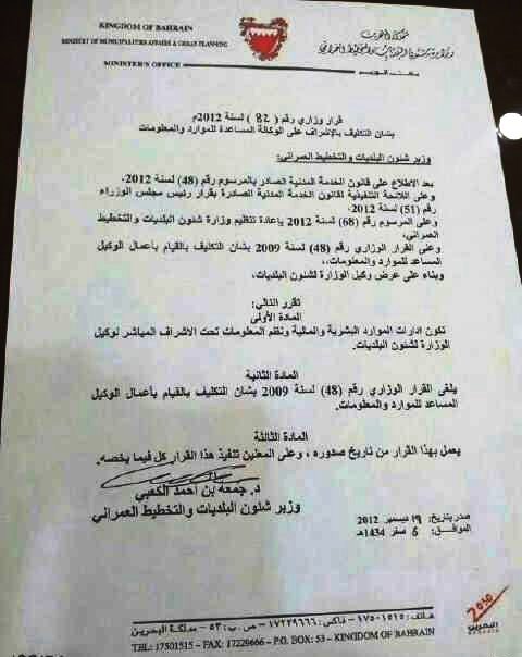 ![]() قرار وزير شؤون البلديات والتخطيط العمراني جمعة الكعبي ضد الشيخ (اضغط للتكبير) |