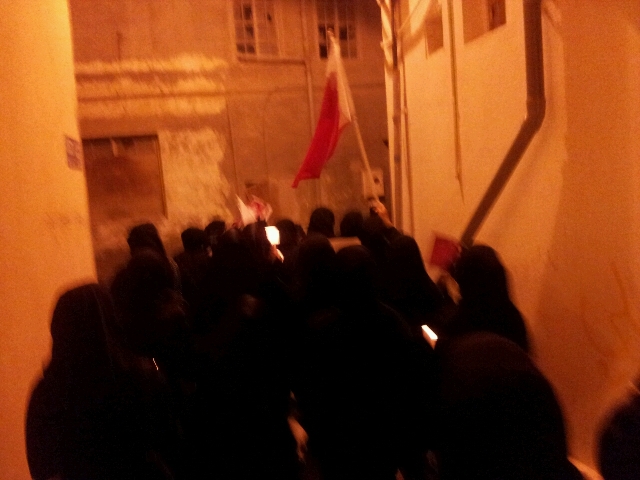 وباغتت القوات الأهالي أثناء تجنعهم في موقع المسيرة بسرعة جنونية واُغرقت الطرقات بالغازات السامة وأطلقت الرصاص عشوائياً لمدة نصف ساعة، إلا أن أهالي القرية تجمعوا مجددأً وانطلقوا في مسيرة جابت أرجاء القرية الداخلية تجنبا للمواجهات وسط حضور أمني مكثف لقوات الأمن في محيط القرية. وحمل المتظاهرون أعلام البحرين وصور شهداء القرية رضي وعلي الحايكي، كما رفعوا لافتات تطالب بالافراج عن المعتقلين الحقوقيين. وقد تفرقت المسيرة بعد ورود أنباء عن دخول القوات من جديد لقمع المتظاهرين.