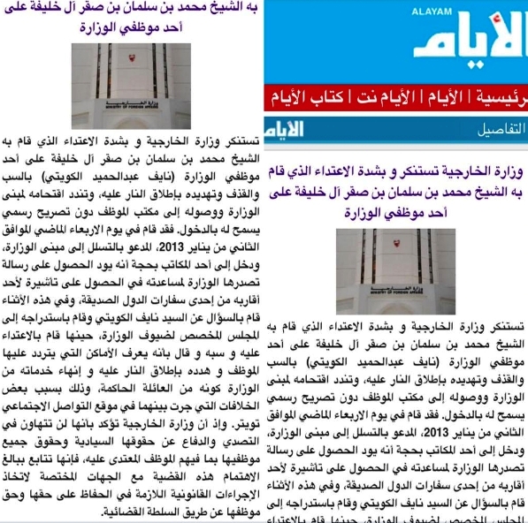 وكانت وزارة الخارجية قد عممت بياناً الليلة جاء فيه «قام في يوم الأربعاء الماضي الموافق الثاني من يناير 2013، أحد أفراد العائلة الحاكمة محمد بن سلمان بن صقر آل خليفة بالتسلل إلى مبنى الوزارة، ودخل إلى أحد المكاتب بحجة أنه يود الحصول على رسالة تصدرها الوزارة لمساعدته في الحصول على تأشيرة لأحد أقاربه من إحدى سفارات الدول الصديقة، وفي هذه الأثناء قام بالسؤال عن موظف وقام باستدراجه إلى المجلس المخصص لضيوف الوزارة، حينها قام بالاعتداء عليه وسبه وقال بأنه يعرف الأماكن التي يتردد عليها الموظف وهدده بإطلاق النار عليه وإنهاء خدماته من الوزارة كونه من العائلة الحاكمة، وذلك بسبب بعض الخلافات التي جرت بينهما في موقع التواصل الاجتماعي تويتر.