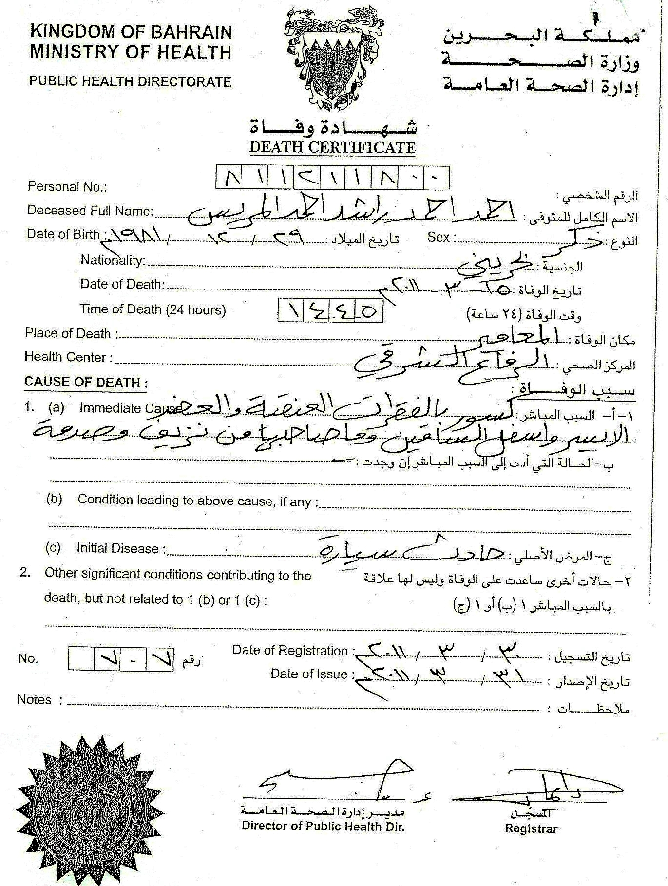 مرآة البحرين: بينت وثيقة مسرّبة من وزارة الصحة أن الشرطي أحمد المريسي (30 عاماً) توفي في حادث سير. وتظهر شهادة الوفاة المؤرخة في 31 مارس/ آذار 2011 والموقعة من مدير إدارة الصحة العامة، أن السبب المباشر للوفاة، هو «حادث سيارة»، ولا وجود لأية إشارة بتعرضه إلى الدهس.