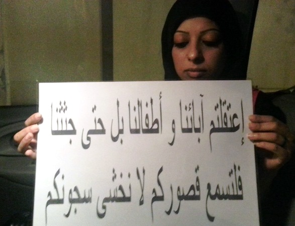 ونشر نشطاء صورة لها، وهي ترفع لافتة أمام القصر، الذي يستخدم للضيوف، كتب عليها "اعتقلتم آباءنا وأطفالنا بل حتى جثثنا فلتسمع قصوركم لا نخشى سجونكم"، قبل أن تقوم قوات الأمن بإلقاء القبض عليها. يأتي ذلك عقب تأييد الحكم عليها في محكمة بحرينية اليوم بالسجن شهرا بتهمة دخولها منطقة دوار اللؤلؤة المحظورة منذ إخلائها من قبل الجيش البحريني مارس/ آذار 2011.