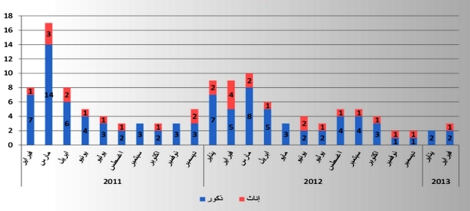 واستمر سقوط الشهداء بمعدل شهيدين لكل شهر ما عدا فبراير/شباط الحالي الذي شهد ارتفاعا للعد بـ3 شهداء. وقد ارتفع عدد الشهداء في 2012 إلى 62 بعدما كان 59 في 2011.