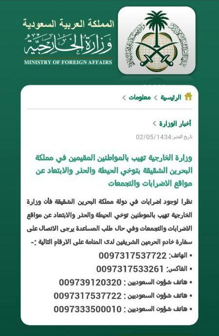 مرآة البحرين: عممت وزارة الخارجية السعودية تحذيراً لرعاياها في مملكة البحرين تطلب فيه توخي الحيطة والحذر والابتعاد عن مواقع الإضرابات والتجمعات.
