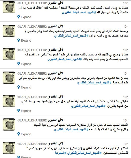 ومن تغريدات الظفيري الذي يمتلك الجنسية البحرينية، يتبين أن ابن أخته المتزوجة في السعودية واسمه أحمد شباط الظفيري، هو «جهادي» - كما وصفه - قاتل في العراق، وتم سجنه في السعودية، وبعدها خرج دون أن تتغير أفكاره، وأنه صار ضمن قائمة المطلوبين الأمنيين لدى السلطات السعودية. وذكر أنه بعد عودته من «الجهاد» في العراق، دخل إلى البحرين وجلس معه لبضعة أيام.