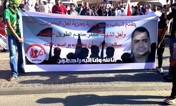 مرآة البحرين: شيع الآلاف في البحرين اليوم جنازة مواطن قتل خنقا بعد استنشاقه الغاز المسيل للدموع. وسارت حشود غاضبة في جنازة الشهيد جعفر الطويل (35 عاما) في منطقة سترة جنوبي العاصمة المنامة.