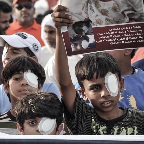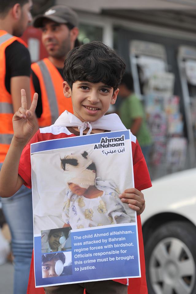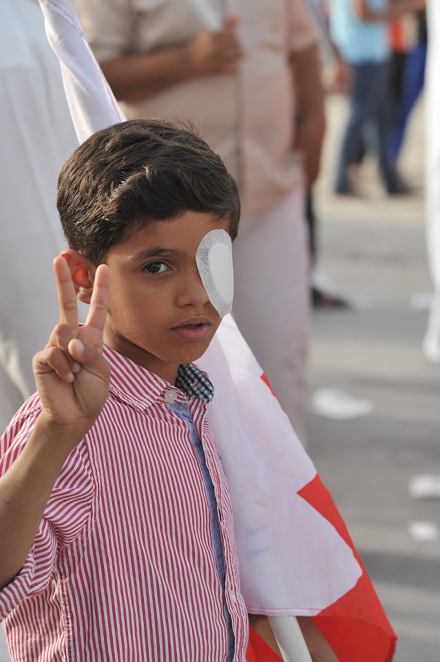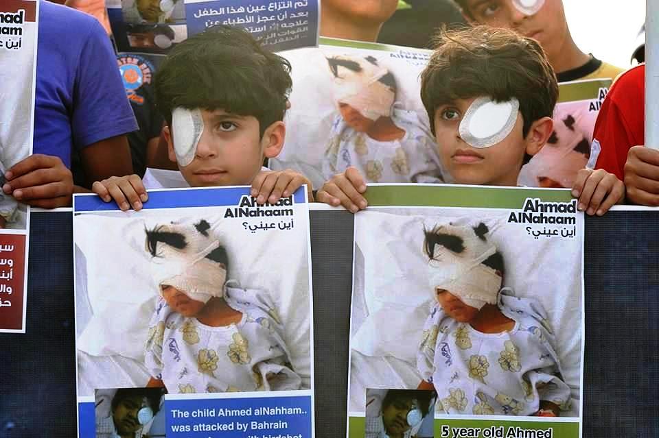 مرآة البحرين (خاص): بالأمس، تقدم عشرات الأطفال المسيرة التي خرجت من منطقة الدير، وهم يضعون ضمادات على أعينهم ويرفعون صور الطفل أحمد النهام (5 سنوات). مازال (أحمد) في المستشفى في سنغافورة، بعد أن انتزعت عينه اليسرى التي بقيت مخرقة بشظايا الشوزن عاماً كاملاً، أخبر الأطباء عائلته باحتمال تأثيرها على العين السليمة.