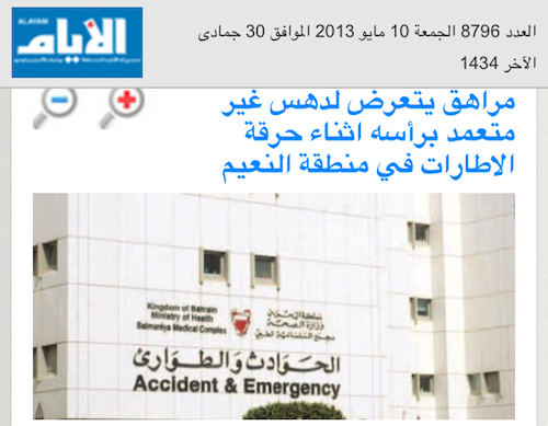 مرآة البحرين (خاص): حذفت صحيفة الأيام من موقعها الإلكتروني وكذلك صفحتها في تويتر، الخبر الذي نشرته مساء اليوم تحت عنوان «مراهق يتعرض لدهس غير متعمد برأسه أثناء حرقه الإطارات في منطقة النعيم»، اتهمت فيه، عبر صحفيتها (تمام أبو صافي)، نقلاً عن من أسمتهم (شهود عيان)، قيام الفتى (الضحية) مع من أطلقت عليهم "مجموعة من المخربين بإضرام النار بالإطارات في الشارع". وقد تم حذف هذا الخبر واستبداله بآخر مغاير تماماً، بعد تصريح الداخلية الذي نشرته على صفحتها في تويتر بـ"تعرض شخص لحادث مشاة في منطقة النعيم، وقد تم نقله للمستشفى، الجهات المختصة تباشر الواقعة"، هذا ولم تذكر الداخلية أي تفاصيل إضافية.