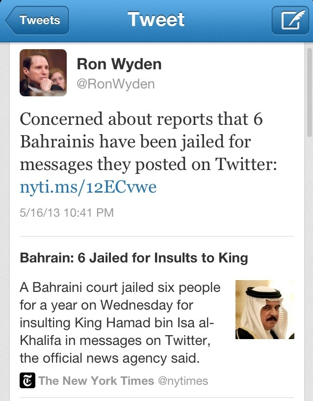 مرآة البحرين: أبدى السيناتور الأمريكي "رون وايدن" قلقه من الحكم على 6 بحرينين بالسجن بتهمة إهانة الملك عبر حساباتهم في "تويتر".
