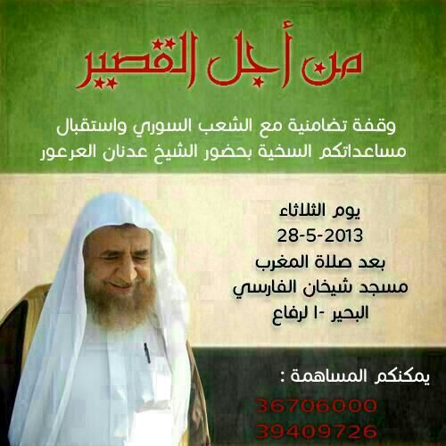 ومن المقرر، أن يشارك العرعور في حملة لجمع الأموال للجهاديين تقام في مساء اليوم بمسجد شيخان الفارسي في منطقة البحير بالرفاع، جنوبيّ العاصمة المنامة.