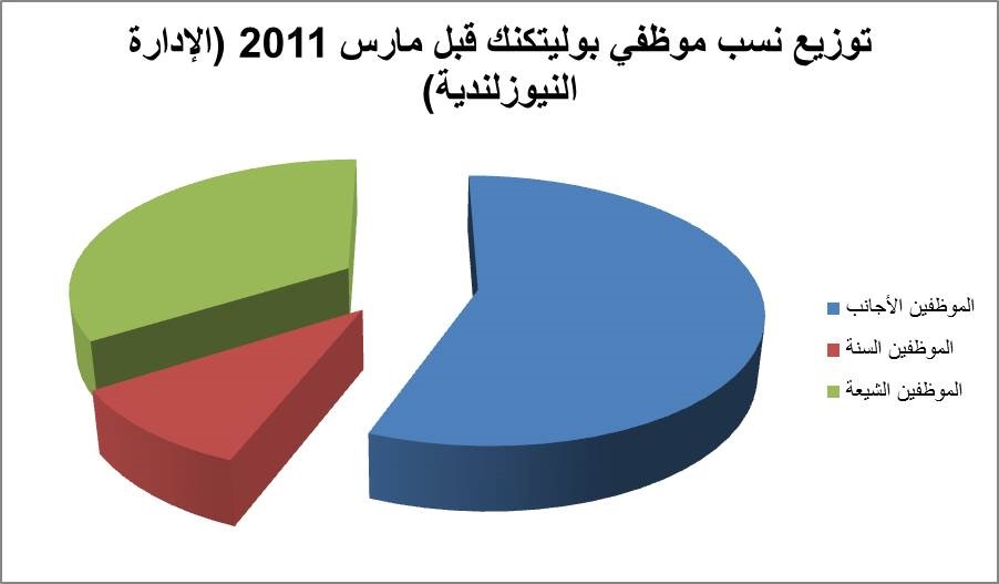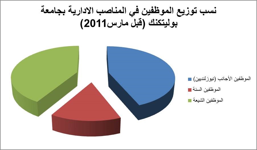 بالإضافة إلى المدرسين الأجانب، تم تهميش ونقل 9 موظفين بين مدير ومسئول ومختص، ينتمون جميعهم إلى طائفة معينة، بهدف إقصاء الموظفين "الشيعة" من مراكز القرار والسيطرة على جميع أقسام الكلية، وبذلك تغيرت تركيبة المناصب الإدارية والوظيفية لا من أجل المهنية بل من أجل إحلال طائفة بدل أخرى، وتظهر الرسوم البيانية سيطرة طائفة معينة على جميع الوظائف في الكلية، بعد انتقالها لإدارة وزارة التربية، تحقيقا لأهداف الخوالد البندرية.