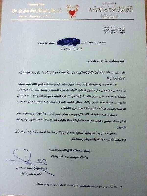 النائب المتشدد جاسم السعيدي برر مقترحه بمساعدة السوريين لرفع الظلم عنهم، مشيرا إلى أن من شأن مبادرته أن تحفز المجتمع البحريني على مزيد من الدعم للسوريين.
