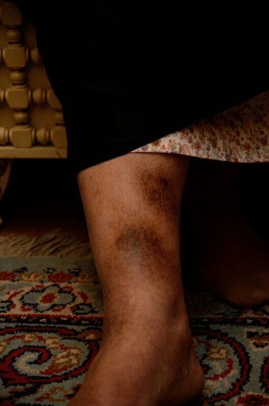 (مرآة البحرين) التقت خديجة، وكان الحديث طويلاً، فيما بقت الغصّة في قلبها وعينها ثابتة طوال اللقاء. قبلت خديجة لأول مرة، أن تنشر من خلال (مرآة البحرين)، صوراً للآثار التي بقت تاركة شهادتها على جسدها لأكثر من عامين. لم تفلح محاولات علاجها في إخفائها. أصرّت البقع الزرقاء أن تبقى، لتفضح نموذجاً من الإجرام الممارس بحق هذا الشعب.