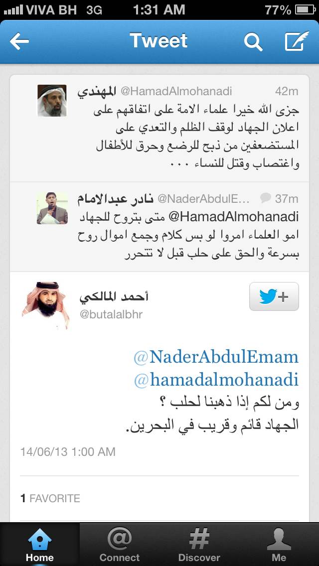 وكان السلفي حمد المهندي قد بارك في صفحته على «تويتر» بارك فتوى أصدرها علماء المسلمين بالجهاد في سوريا، فرد عليه الناشط نادر عبدالامام بسؤال ومتى ستذهب للجهاد هناك، قبل أن يرد عليه رئيس كرامة بالقول "ومن لكم إذا ذهبنا لحلب؟ الجهاد قائم وقريب في البحرين".
